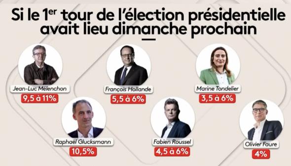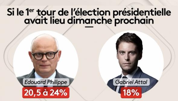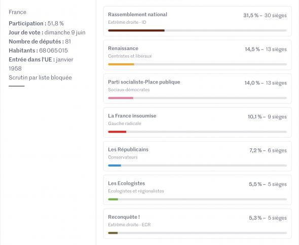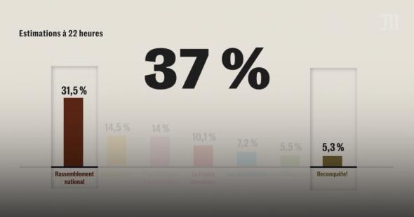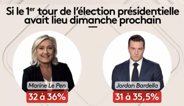 Le RN obtiendrait 31 % des voix au premier tour des législatives le 30 juin devant l’alliance de gauche à 28 %, la majorité à 18 % et LR à 6,5 %, selon un sondage Elabe qui donne une majorité relative en sièges au parti de Jordan Bardella à l’issue du second tour le 7 juillet. Dans cette enquête réalisée pour BFMTV et La Tribune Dimanche, "en fonction du rapport de force actuel mesuré dans l’intention de vote et du résultat aux élections précédentes, le Rassemblement national obtiendrait entre 220 et 270 sièges, l’alliance de gauche entre 150 et 190 sièges, Renaissance/alliés entre 90 et 130 sièges, LR/DVD entre 30 et 40 sièges et les autres forces politiques entre 10 et 20 sièges". L’institut précise que ce sondage a été réalisé "en majeure partie" avant la conférence de presse d’Emmanuel Macron.