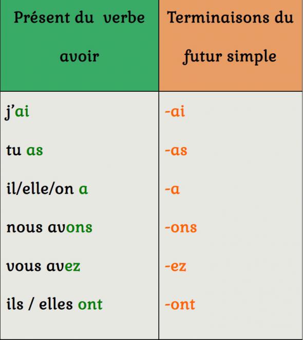 Pour former le futur simple, on ajoute à l'infinitif les terminaisons : "-ai", "-as", "-a", "-ons", "-ez", "-ont".